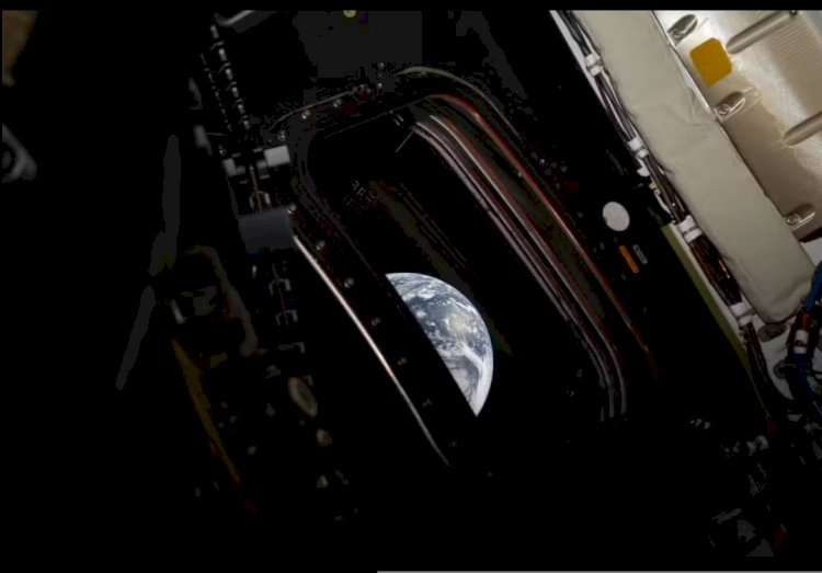 Em outro registro divulgado pela agência espacial, a Terra surge enquadrada por uma das janelas da cápsula Orion, reforçando a sensação de distanciamento progressivo do planeta à medida que a missão avança em direção ao espaço profundo.