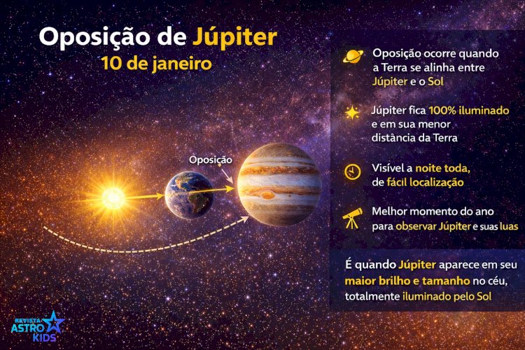 No dia 10 de janeiro, o planeta Júpiter atinge o ponto de oposição, uma configuração astronômica especial que marca o melhor período do ano para observação do gigante gasoso.